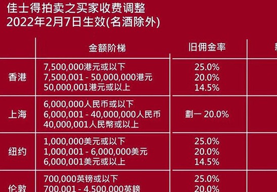 近日,佳士得拍卖行宣布调整佣金收费(Buyer's Premium)。这是一年多以来首次加价。这回的佣金调整,只限于金额阶梯最低一级,佣金率上调1%。金额阶梯的分界线亦有所改变,最低一级的上限增加50% - 75%不等,视不同拍场而异,其余两级的佣金率则没有变动。新收费刚于2月7日生效。