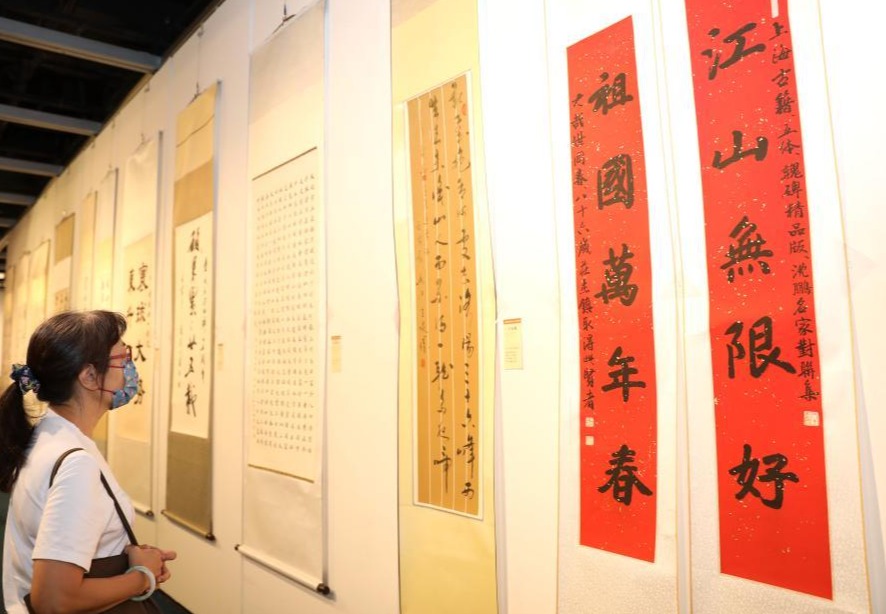 8月15日,观众在由中国书协香港分会主办的“笔壮喜迎开新局 十年磨剑闯荆途”书法作品展上观赏。