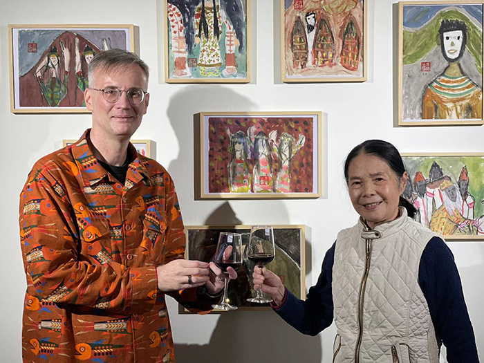 中央民族大学留学生阳光(中文名)在文德作品前合影,“我太喜欢他的画了!”
