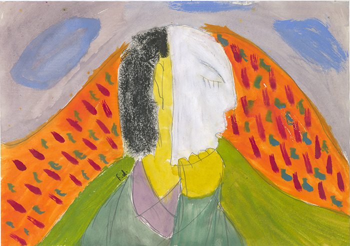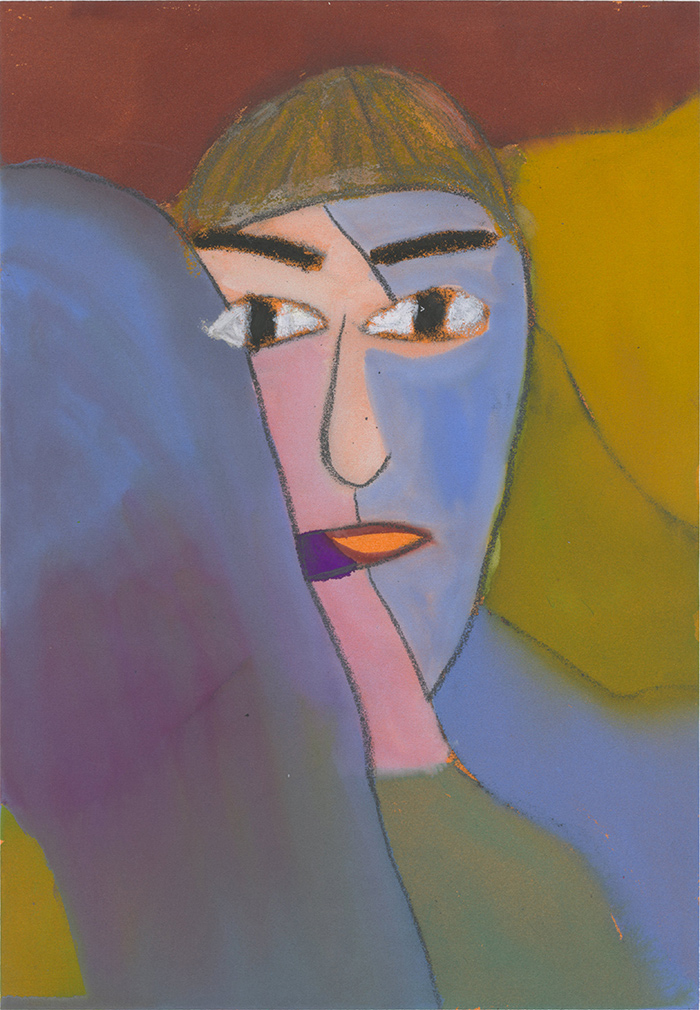 这幅作品参考英文“人(person)”一词的词源描述身份的多样性。Persona这一拉丁词源,最初意为“面具”。作品中的男子戴着白色面具,面无表情地为他人“表演”。背后这座满是彩色字符的橘色山脉,象征着面具背后真正发生的事情: 相比起他所呈现的毫无表情的面具,面具背后的身份要更加复杂且丰富。然而,当他遇到别人时,戴上面具是他应对挑战的唯一方法。有时,我们可以做“自己”,但有时,我们也像演员一样在舞台上表演。