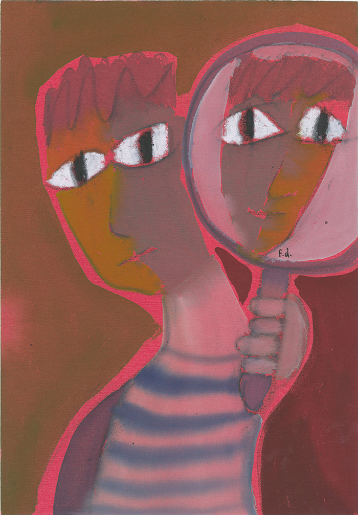镜子是文德作品中常见的元素之一,它有时是画中人的反射,有时是通往另一个世界的通道,有时又是自我之于他者的一种参照。作品《条纹男孩3》中的主角就不是在照镜子,而是将镜子转向观众。这幅作品提醒我们“他者”将影响我们如何看待自己。我们身份的存在和转变,都受到“他者”的影响。这幅画亦是文德最新出版的法语专著《L’interculturalité en miettes》(2022年)的封面。