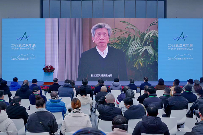 作为本次展览总策展人,中央美术学院院长、中国美术家协会主席范迪安发来视频表示祝贺。范迪安在视频中表示,双年展是一座城市经济社会发展和文化建设兴旺发达的标志,而2022武汉双年展彰显了中国艺术的时代精神,展示了中国艺术创造与国际艺术发展的共同趋势,展现了守正创新、探索开拓的艺术发展气象。