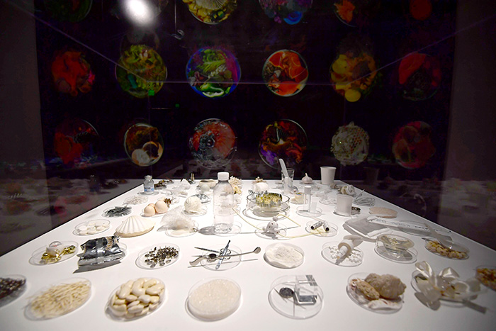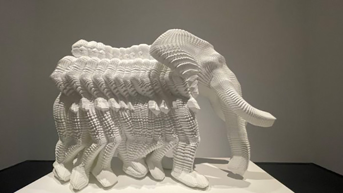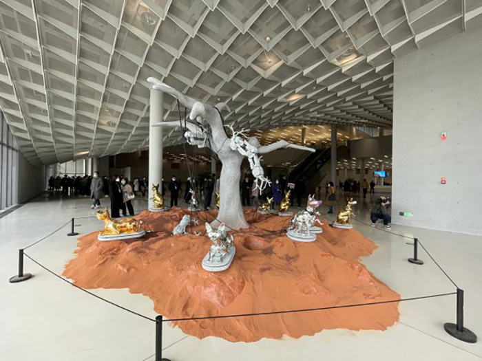 该专题一方面将绿生态主题作为一个全球、全人类在今天面对的共同议题,另一方面也在地化地关注到本地的努力和艺术表达。这个单元中共有39位中外艺术家参展,被分为“金”“木”“水”“火”“土”五个板块。其中,艺术家隋建国的雕塑作品作为“金”板块的代表,被安放在美术馆入口处;而艺术家杨心广用7000棵模型树搭建的“绿色小径”,邀请观众在中间通行而构成了展览的一部分。