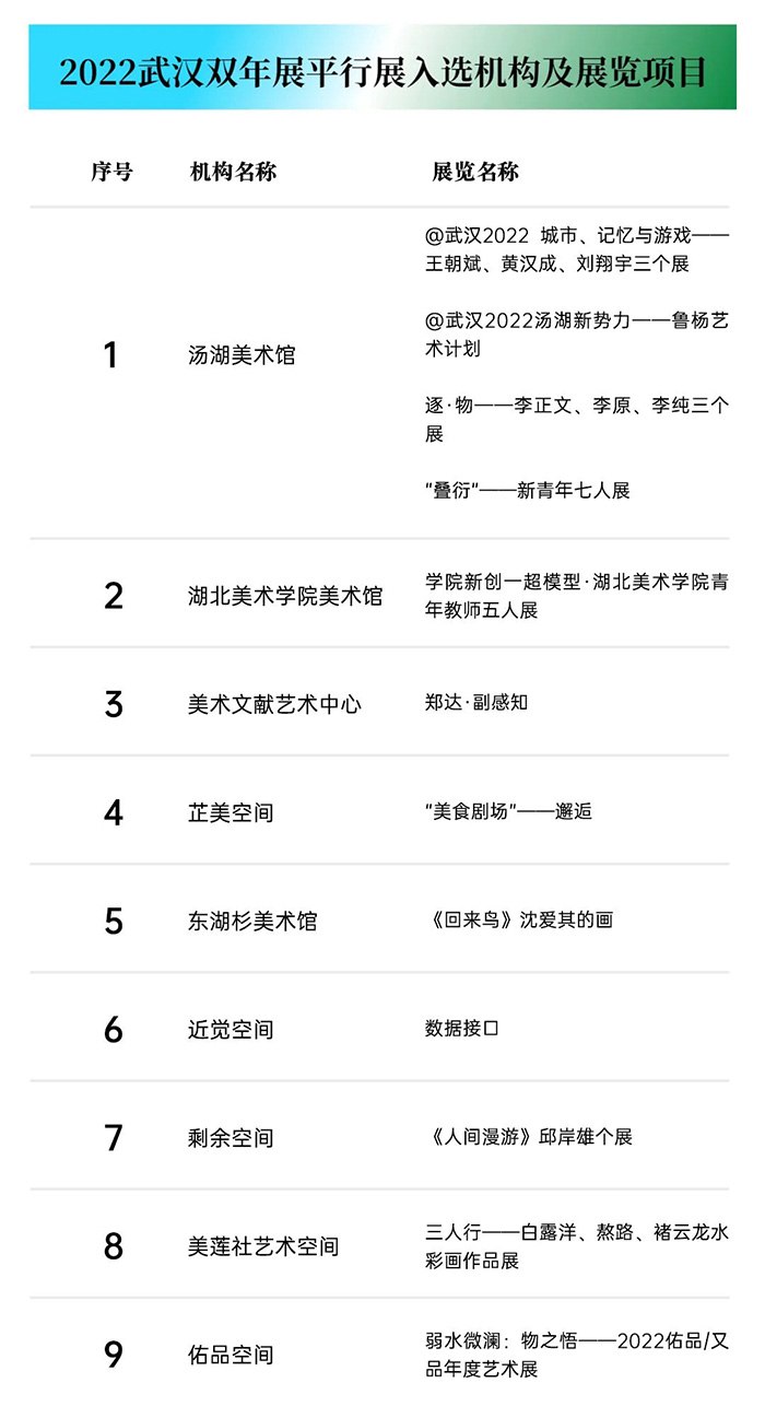 在双年展期间,遍布全市的许多艺术机构、画廊通过平行展也将加入进来。其中,汤湖美术馆、湖北美术学院美术馆、美术文献艺术中心、芷美空间、东湖杉美术馆、近觉空间、剩余空间、美莲社艺术空间、佑品空间等九家艺术机构都将以双年展平行展场馆的身份参与其中。