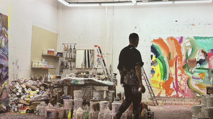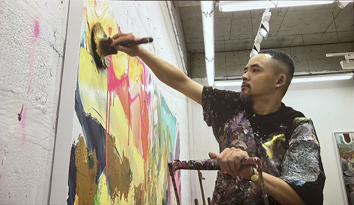 在韦嘉的绘画剧场中,身体始终是心理流动的容器。从早期石板画里那些紧绷青涩的浅浮雕的青春胴体,到卡通时期带有自毁倾向的少年肉身,直至近年画布上沸腾的人体能量漩涡,艺术家用三十余年时间完成了身体书写的三重变奏。现场播放的纪录片也展示了韦嘉当下的创作状态,在他的工作室中,堆积着小山一般高的颜料桶,韦嘉的工作服上滴满颜料,艺术家用大笔刷和自己的臂膀在巨大的画布上来回涂刷颜料,艺术家身体的动势直接在画布上产生身体形象的关联。画面上虚实相生的身体群像,实则是艺术家创作姿态的镜像投射——那些被抹去面庞的躯体轮廓,那些溶解在色层风暴中的肢体断片,正在将绘画过程本身的肉身性转化为全新的视觉寓言。