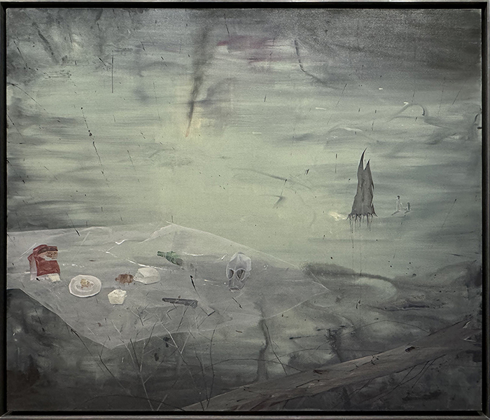 韦嘉的绘画往往充满耐人寻味的场景设置,无论是人造景观还是自然环境,都呈现某种超现实主义的剧场感,尤其在他早期和中期的作品中,梦境般的氛围尤为突出。在石版画和卡通系列中,他通过超常规的物体摆放和比例组合赋予画面玄思与神秘感。例如,在《草地野餐Ⅱ》中,他描绘了一对青年男女野餐的场景——草地上铺着餐布,摆放着食物,然而,一枚头骨和一把手枪的突兀存在,加上草地右侧两个比例失衡、微小的人物形象,使得原本欢愉的场景弥漫着空寂与不安的氛围。
