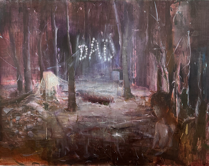 类似的戏剧性设置在他的多件作品中均有体现:《白头到老Ⅱ》——一位青春少年却满头白发,身上缠绕荆棘,时间与生命的矛盾在画面中交错;《远在浅野烟林》——一位少年骑在一只血盆大口的猛虎之上,仿佛梦境与现实的交界;《DAD》——一顶白色帐篷伫立在幽暗的森林里,上空悬挂着霓虹灯般的DAD字母,充满隐喻与暧昧不明的象征。 这些跳脱现实的场景与元素,使画面呈现出独特的叙事方式。